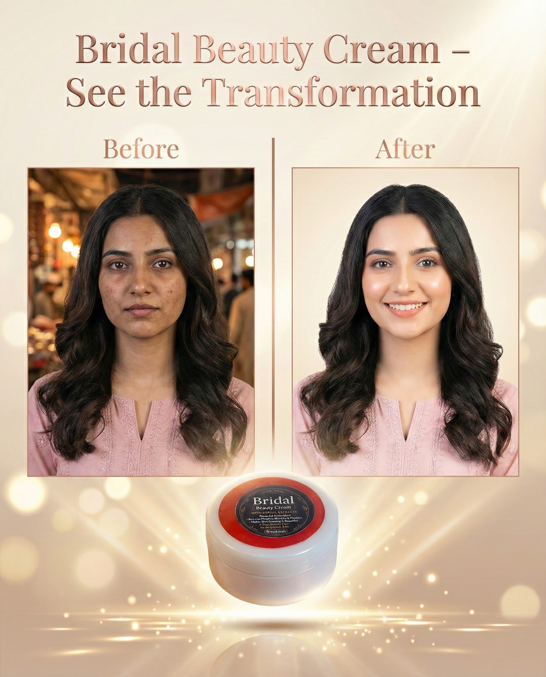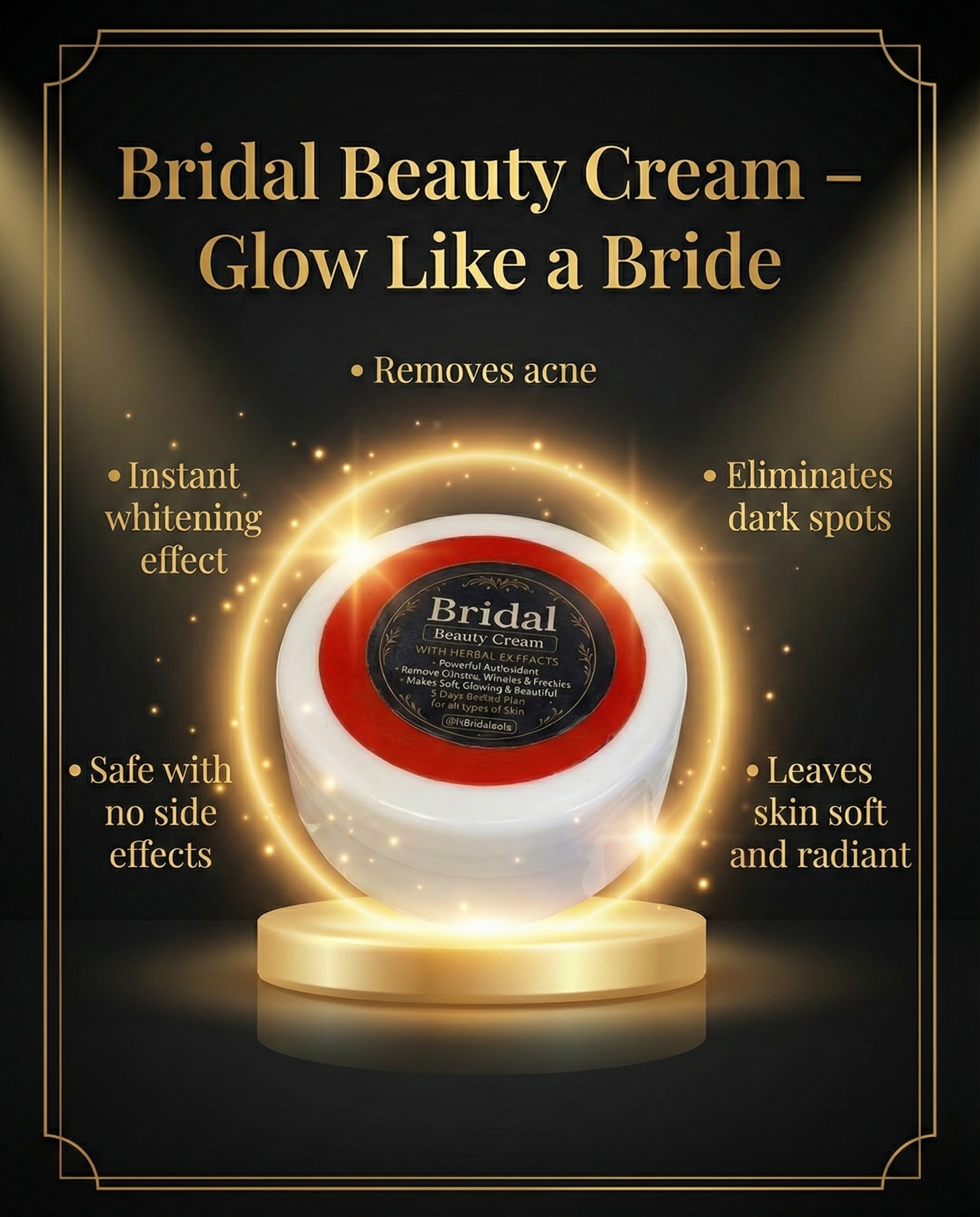 Bridal Beauty Cream gives instant brightening, clear glowing skin, and fades dark spots within 3–5 days. Helps remove pimples, freckles, wrinkles, and dullness. Lightweight, fast absorbing, and suitable for all skin types.