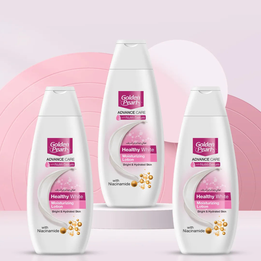 Golden Pearl Healthy White Moisturizing Lotion hydrates, nourishes, and evens skin tone with a blend of Vitamins B3, C, and E for smooth, radiant skin.